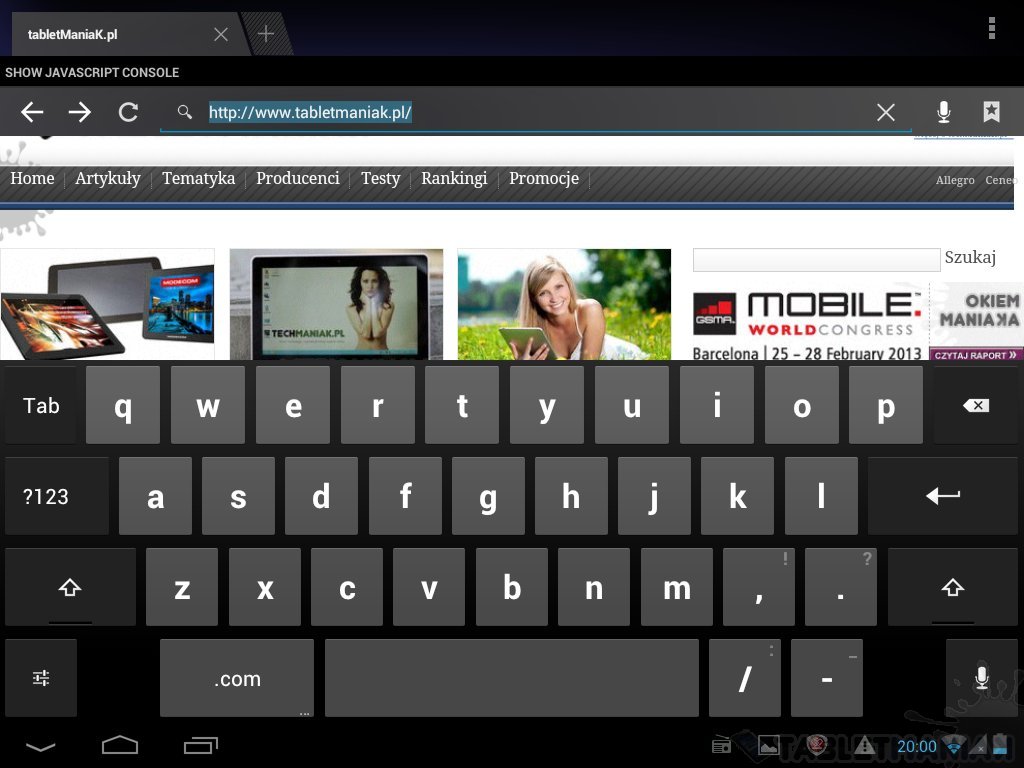 Klawiatura ekranowa składa się z czterech rzędów przycisków. Bez względu na układ, klawisze są równomiernie rozłożone na całej szerokości wyświetlacza. Po obróceniu tabletu o 90 stopni urządzenie jest dobrym narzędziem do czytania PDFów i przeglądania stron, do pisania lepiej raczej korzystać z układu poziomego.