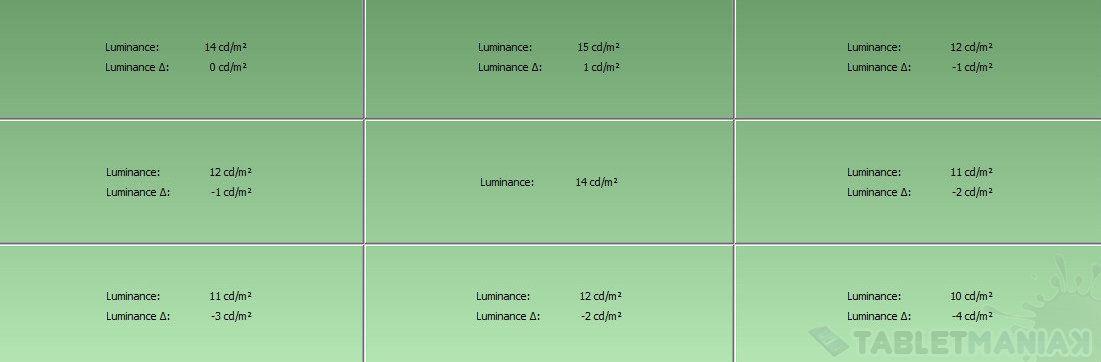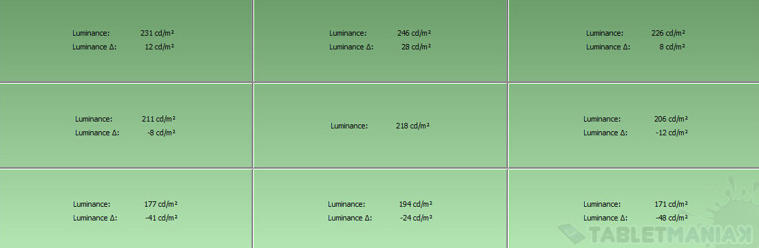Maksymalna jasność matrycy to około 218 cd/m2, przy 100-procentowej sile podświetlenia, przy czym nierównomierność podświetlenia sięga aż 31%. Jasność możemy zmieniać płynnie – najmniejsza wartość to 14 cd/m2. Na pokładzie nie znajdziemy czujnika oświetlenia. Matryca nie migoce w żadnym punkcie, nie zauważyłem również przebarwień i „martwych pikseli”.