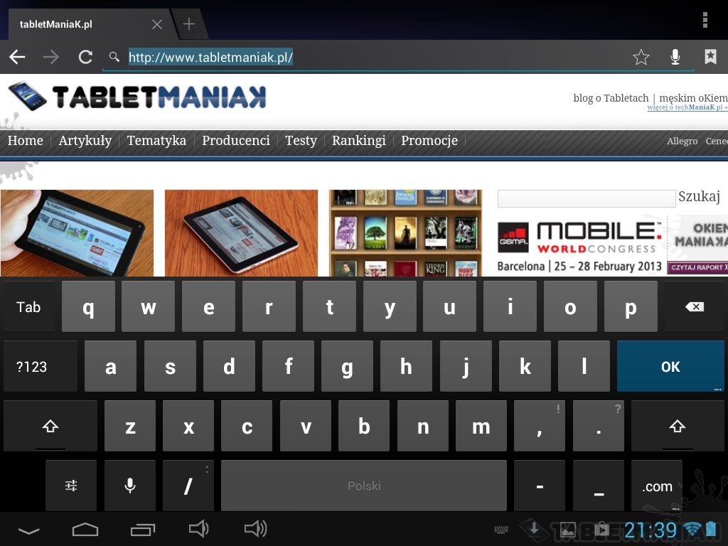 Klawiatura ekranowa składa się z czterech rzędów przycisków. Bez względu na układ, klawisze są równomiernie rozłożone na całej szerokości wyświetlacza. Po obróceniu tabletu o 90 stopni urządzenie jest dobrym narzędziem do czytania PDFów i przeglądania stron, do pisania lepiej raczej korzystać z układu poziomego.