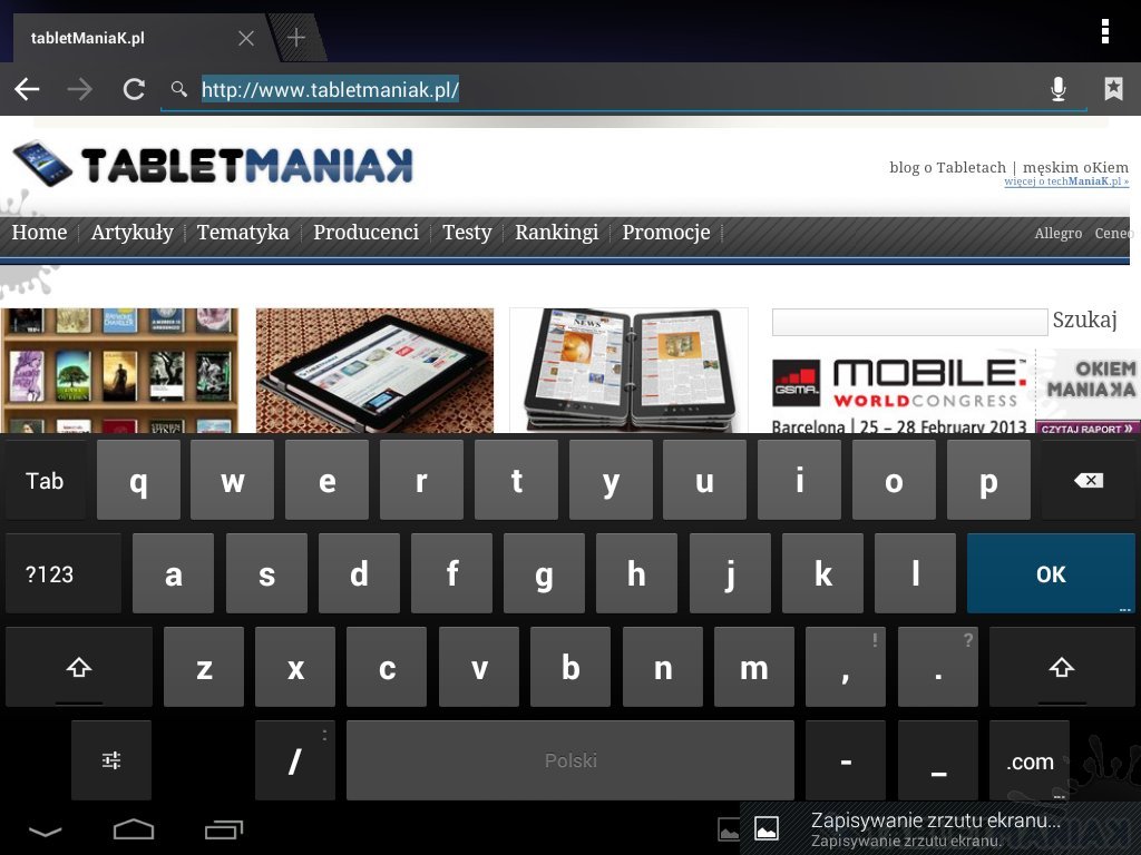 Klawiatura ekranowa składa się z czterech rzędów przycisków. Bez względu na układ, klawisze są równomiernie rozłożone na całej szerokości wyświetlacza. Po obróceniu tabletu o 90 stopni urządzenie jest dobrym narzędziem do czytania PDFów i przeglądania stron, do pisania lepiej raczej korzystać z układu poziomego.