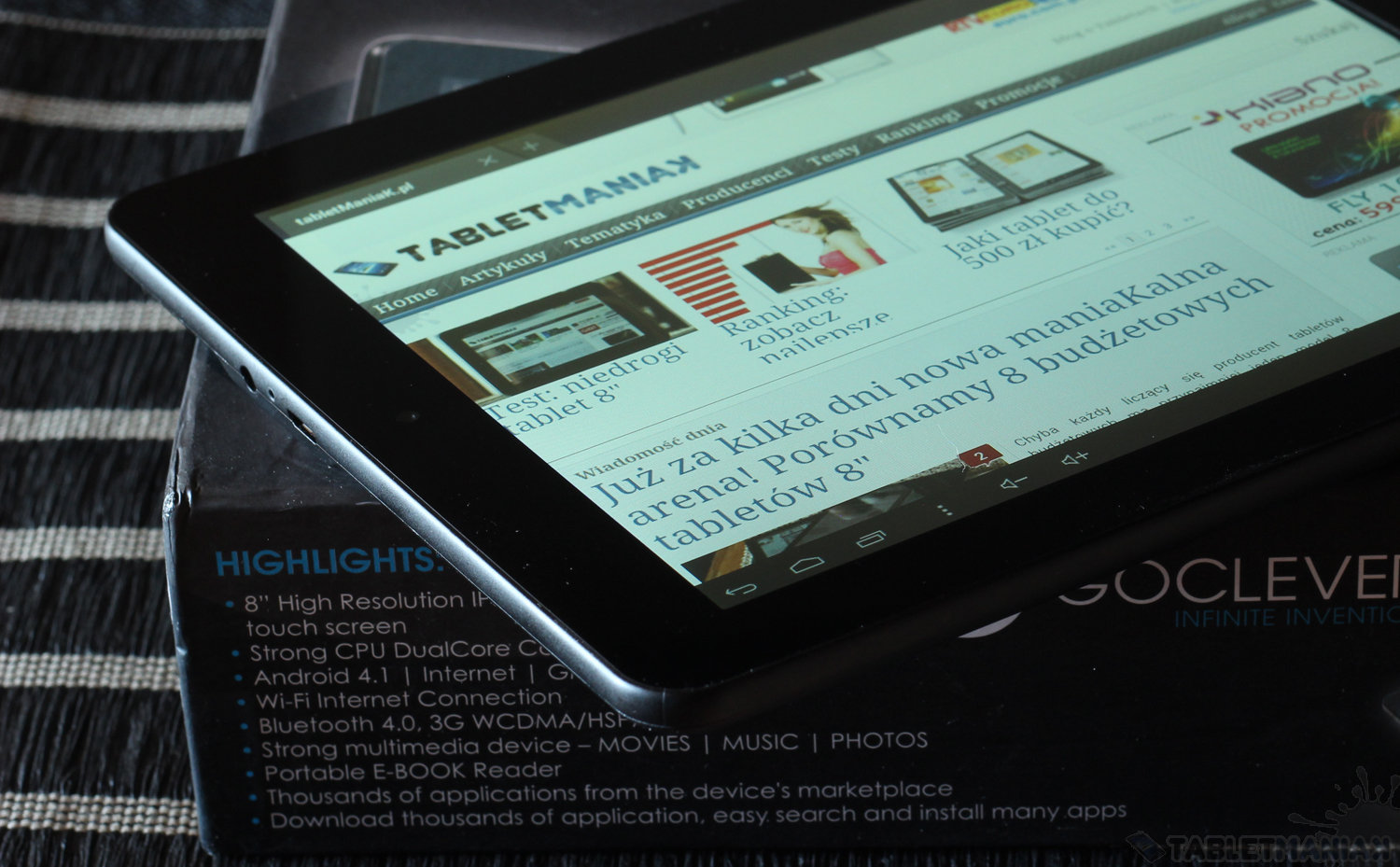 GOCLEVER TAB M813G to sprzęt zaprojektowany z myślą o osobach szukających sprzętu mobilnego z funkcją dzwonienia, z trochę większym ekranem, niż te wykorzystywane w smartfonach. Tablet wyposażono w dwurdzeniowy procesor o taktowaniu 1,2 GHz oraz wyświetlacz IPS o świetnych kątach widzenia. Ponadto na pokładzie znajdziemy rozbudowane zaplecze komunikacyjne. Oprócz modemu 3G jest także moduł Bluetooth i GPS. Sprzęt zawitał w naszej redaKcji, a to oznacza, że już niedługo możecie liczyć na pełną maniaKalną recenzję. Tymczasem zerknijmy do pudełka.
