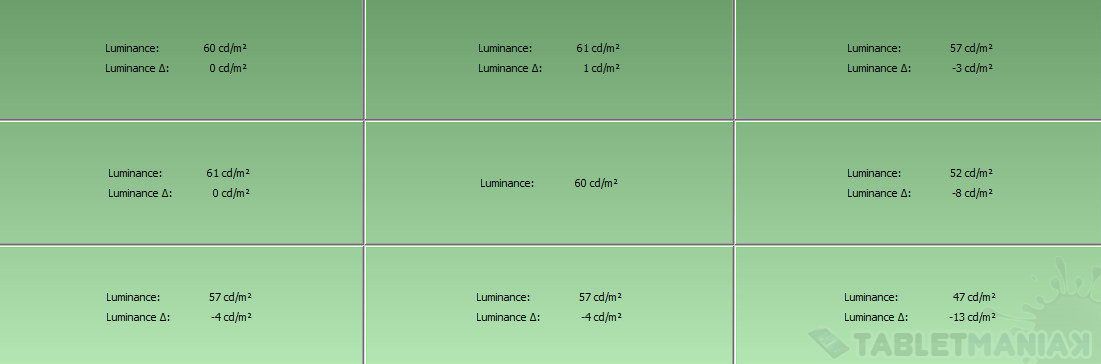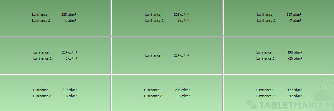 Maksymalna jasność matrycy to 224 cd/m2, przy 100-procentowej sile podświetlenia, przy czym nierównomierność podświetlenia sięga 21%. Jasność możemy zmieniać płynnie w szerokim zakresie, a najmniejsza wartość to 60 cd/m2. Na pokładzie nie znajdziemy czujnika oświetlenia. Matryca nie migoce w żadnym punkcie, nie zauważyłem również przebarwień i “martwych pikseli”.