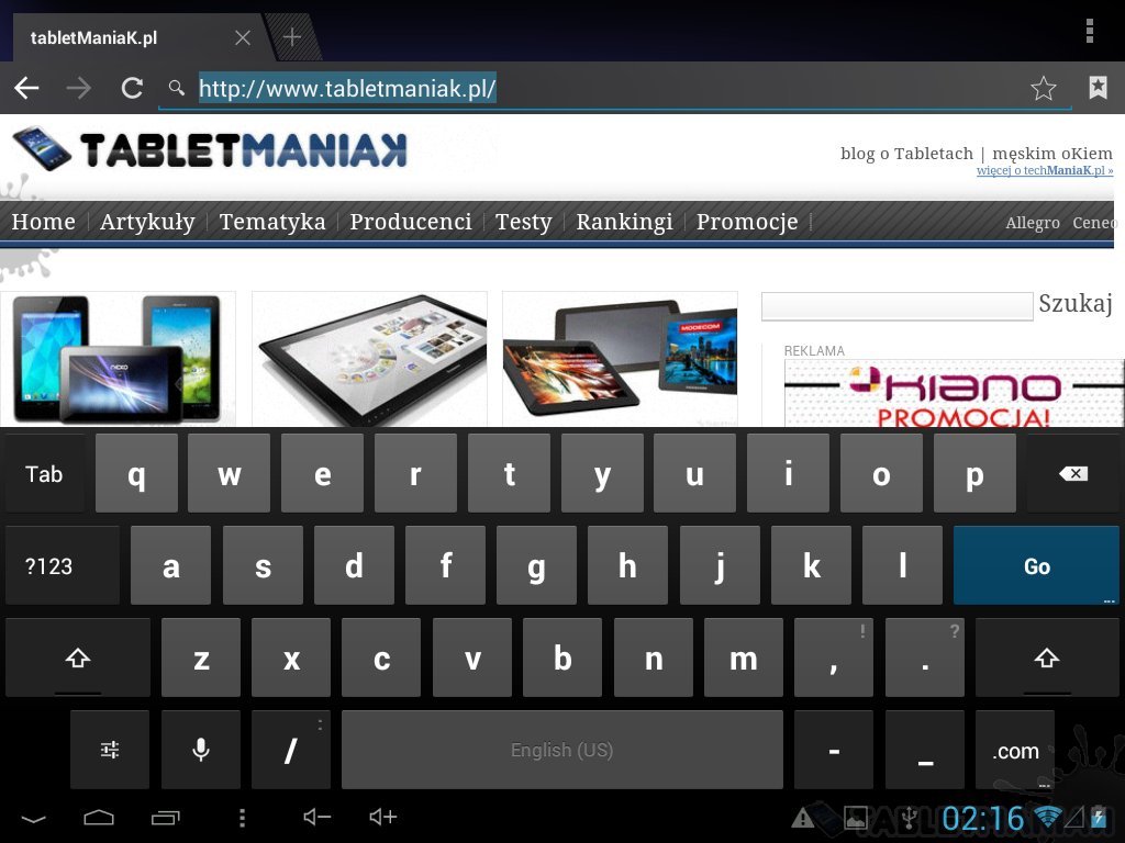 Klawiatura ekranowa składa się z czterech rzędów przycisków. Bez względu na układ, klawisze są równomiernie rozłożone na całej szerokości wyświetlacza. Po obróceniu tabletu o 90 stopni urządzenie jest dobrym narzędziem do czytania PDFów i przeglądania stron, do pisania lepiej raczej korzystać z układu poziomego.