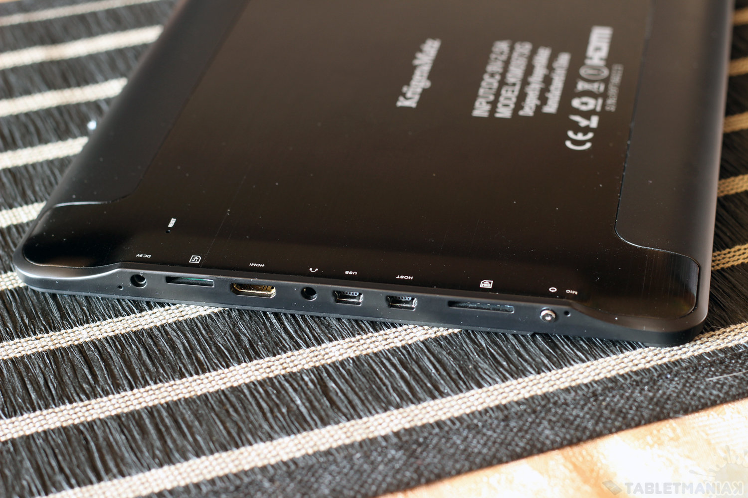 KM0973G został wyposażony w rozbudowany zestaw portów – dedykowane złącze zasilania, sloty kart SIM i microSD, miniHDMI oraz gniazdo minijack 3,5 mm (do którego możemy podpiąć słuchawki lub głośniki). Tablet jest na tyle gruby, aby pomieścić pełnowymiarowe złącze USB, ale zamiast niego znajdziemy dwa miniUSB – jedno w standardzie HOST, drugie obsługujące technologię OTG. Sprzęt poprawnie wykrywa i obsługuje pamięci przenośne, urządzenia wskazujące, dyski zewnętrzne z zasilaniem oraz koncentratory USB. Przez komputer tablet jest wykrywany jako pamięć masowa.