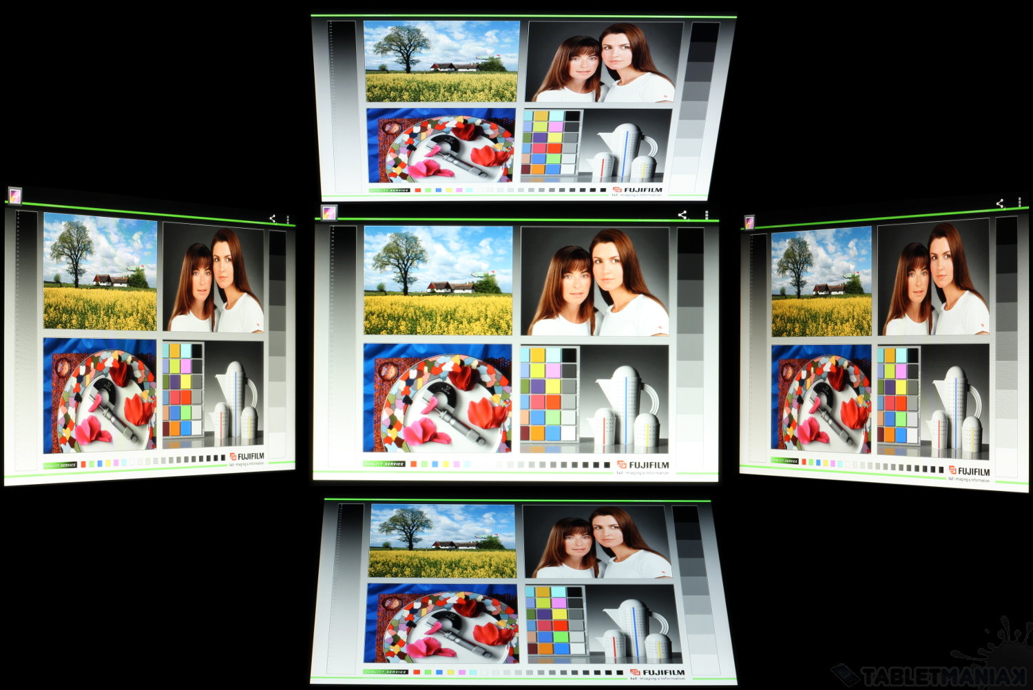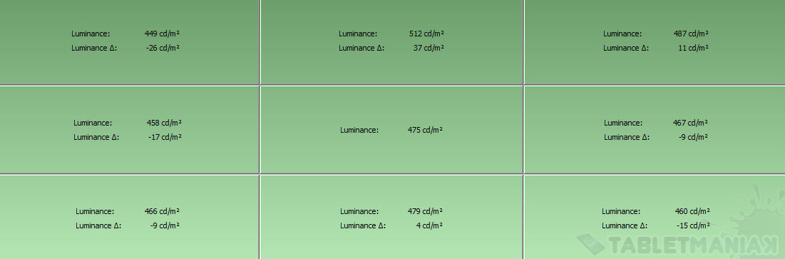 Maksymalna jasność matrycy to 475 cd/m2 (przy 100-procentowej sile podświetlenia), co jest wartością rzadko spotykaną nie tylko w tym segmencie sprzętu, ale też w laptopach czy monitorach. To oznacza, że komfortowa praca będzie możliwa już przy 25-procentowej sile podświetlenia. Warto też zauważyć, że pomimo dużej jasności, nierównomierność podświetlenia sięga tylko 13%. Jasność możemy zmieniać płynnie w bardzo szerokim zakresie, a najmniejsza wartość to 74 cd/m2 (co oznacza, że przy najniższym ustawieniu jasności nadal da się korzystać z urządzenia). Na pokładzie nie znajdziemy czujnika oświetlenia. Matryca nie migoce w żadnym punkcie, nie zauważyłem również przebarwień i “martwych pikseli”.