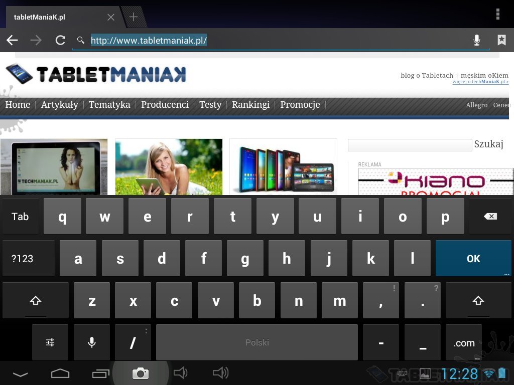 Klawiatura ekranowa składa się z czterech rzędów przycisków. Bez względu na układ, klawisze są równomiernie rozłożone na całej szerokości wyświetlacza. Po obróceniu tabletu o 90 stopni urządzenie jest dobrym narzędziem do czytania PDFów i przeglądania stron, do pisania lepiej raczej korzystać z układu poziomego.