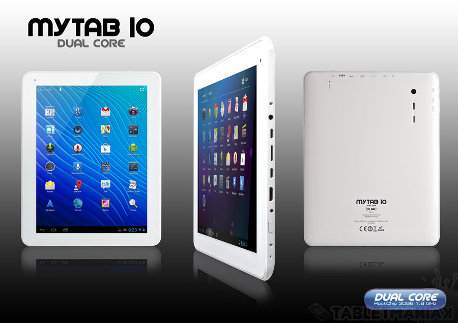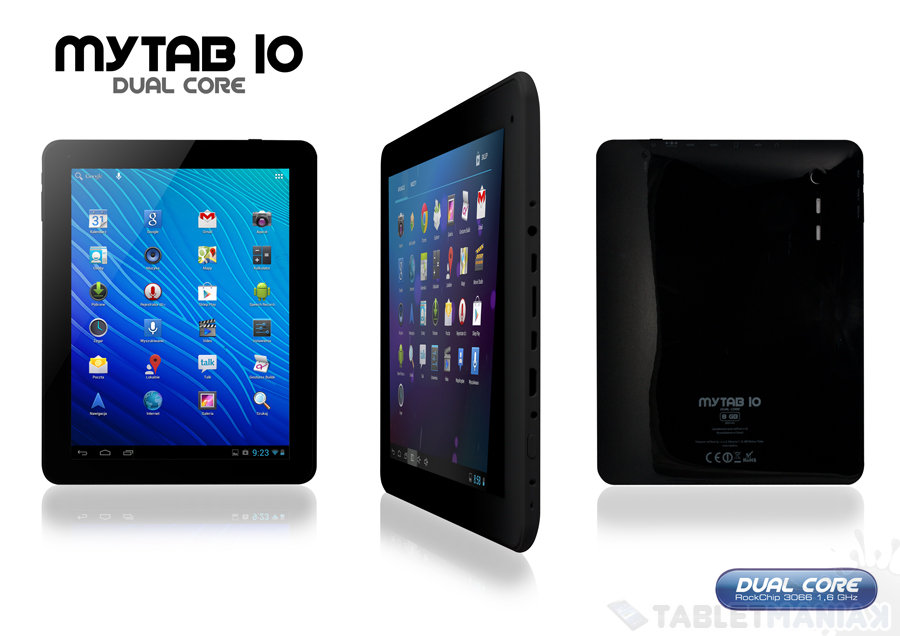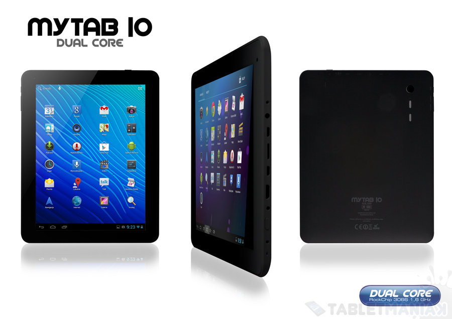 Biały wariant kolorystyczny wykonany został z wysokiej jakości tworzywa sztucznego, wersja czarna tabletu myTAB 10 DualCore wykonana została z tworzywa sztucznego, ale również dostępna jest z gumowanym tylnym panelem. Bez względu na kolor, tablet posiada identyczne podzespoły i może zaoferować potencjalnemu nabywcy 9.7-calowy wyświetlacz z 10-punktowym dotykiem, na którym prezentowany będzie system Google Android 4.1 Jelly Bean w rozdzielczości 1024 x 768 pikseli. Sercem tabletu jest dwurdzeniowy Rockchip RK3066 o częstotliwości taktowania 1.6 GHz z 4-rdzeniowym układem graficznym Mali-400 MP4, który wspierać będzie 1-gigabajtowa pamięć operacyjna RAM. Na dane zarezerwowano 8 GB wewnętrznej pamięci z możliwością rozszerzenia poprzez slot kart micro SD.