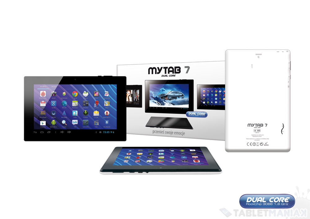 myTAB 7 DualCore to sprzęt, który zaoferuje potencjalnemu nabywcy 7-calowy wyświetlacz, na którym system Google Android 4.1 Jelly Bean prezentowany będzie w archaicznej już rozdzielczości WVGA (800 x 480 pikseli), zaś sprawną pracę zapewni sprawdzony dwurdzeniowy Rockchip RK3066 (ARM Cortex-A9) o częstotliwości taktowania 1.6 GHz, wspierany przez 1-gigabajtową pamięć operacyjna RAM. Na dane oraz multimedia producent zarezerwował zaledwie 4 GB wbudowanej pamięci z możliwością dalszej rozbudowy poprzez wykorzystanie slotu kart micro SD.