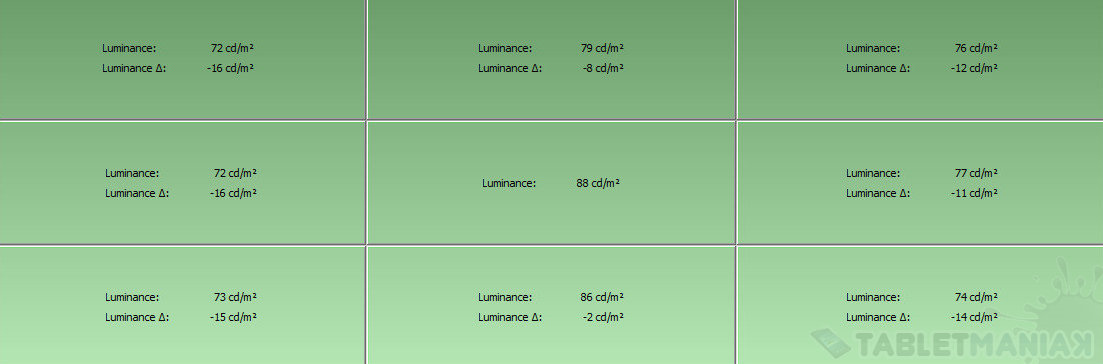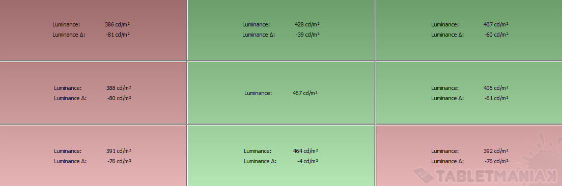 Maksymalna jasność matrycy to 467 cd/m2 (przy 100-procentowej sile podświetlenia), co jest wartością rzadko spotykaną nie tylko w tym segmencie sprzętu, ale też w laptopach czy monitorach. To oznacza, że komfortowa praca będzie możliwa już przy 25-procentowej sile podświetlenia. Nierównomierność podświetlenia sięga 17%. Jasność możemy zmieniać płynnie w bardzo szerokim zakresie, a najmniejsza wartość to 88 cd/m2 (co oznacza, że przy najniższym ustawieniu jasności nadal da się korzystać z urządzenia). Na pokładzie znajdziemy ponadto czujnik oświetlenia, który nam z pewnością pomoże wydłużyć żywotność baterii. Matryca nie migoce w żadnym punkcie, nie zauważyłem również przebarwień i “martwych pikseli”.