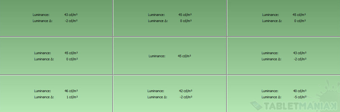 Maksymalna jasność matrycy to 217 cd/m2 (co stanowi standardową wartość w tym segmencie), przy 100-procentowej sile podświetlenia, przy czym nierównomierność podświetlenia sięga 14%. Jasność możemy zmieniać płynnie, a najmniejsza wartość to 45 cd/m2 (przy tej wartości wciąż można pracować w zaciemnionym pomieszczeniu). Na pokładzie nie znajdziemy czujnika oświetlenia. Matryca nie migoce w żadnym punkcie, nie zauważyłem również przebarwień i “martwych pikseli”.
