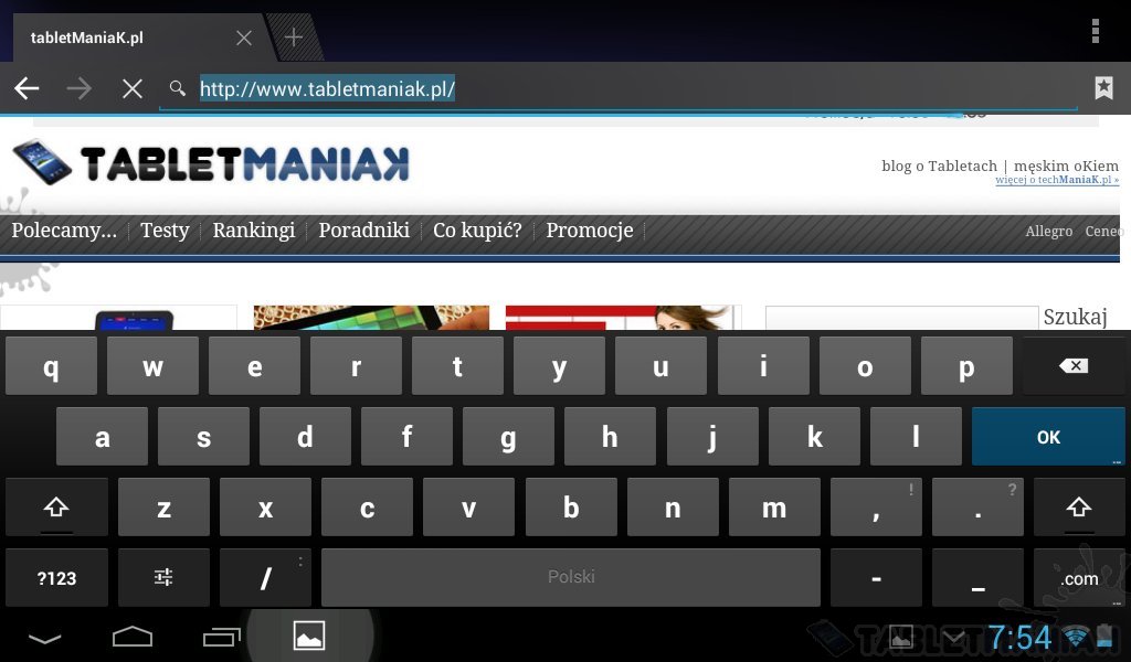 Klawiatura ekranowa składa się z czterech rzędów przycisków. Bez względu na układ, klawisze są równomiernie rozłożone na całej szerokości wyświetlacza. Z uwagi na panoramiczny format tabletu, w praktyce klawiatura jest wygodna tylko przy układzie horyzontalnym. Po obróceniu tabletu o 90 stopni, przyciski stają są zbyt zbite, co obniża komfort pracy. W układzie pionowym urządzenie jest dobrym narzędziem do czytania PDFów i przeglądania stron, do pisania lepiej raczej korzystać z układu poziomego.