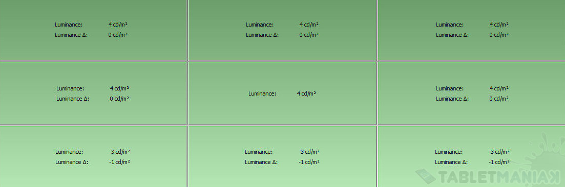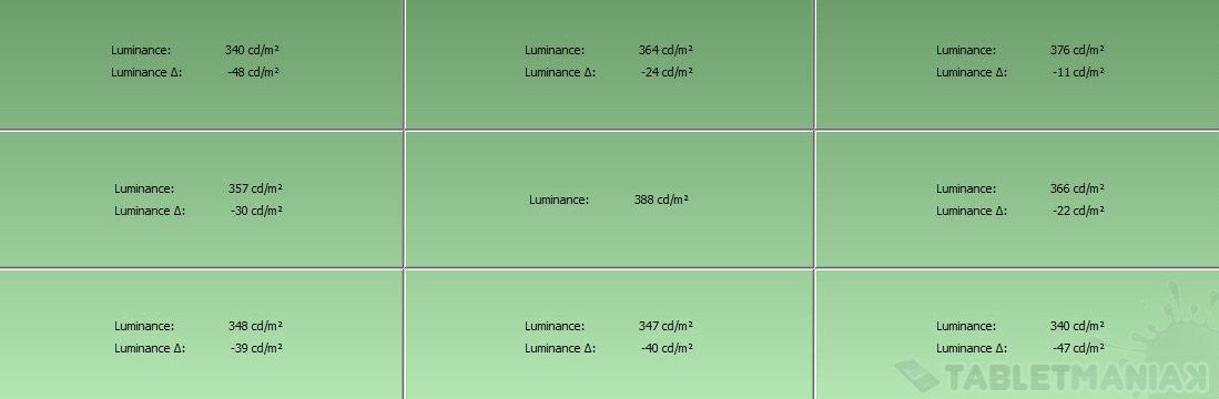 Maksymalna jasność matrycy to aż 388 cd/m2 (więcej, niż oferuje niejeden monitor), przy 100-procentowej sile podświetlenia, przy czym nierównomierność podświetlenia sięga 12%. Jasność możemy zmieniać płynnie w bardzo szerokim zakresie, a najmniejsza wartość to 4 cd/m2 (przy tej wartości praca nawet w zaciemnionym pomieszczeniu jest niemożliwa). Na pokładzie nie znajdziemy czujnika oświetlenia. Matryca nie migoce w żadnym punkcie, nie zauważyłem również przebarwień i “martwych pikseli”.