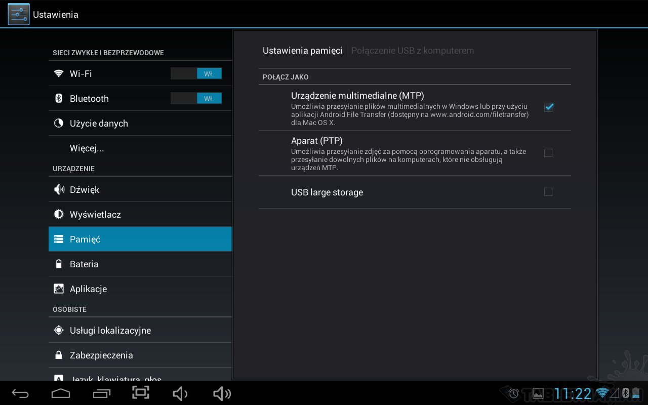 Tablet może połączyć się z komputerem przy pomocy kabla USB w trybie pamięci masowej, urządzenia multimedialnego (MTP) lub PTP. Każda z tych opcji działa bez zarzutu – mamy więc pełna dowolność wyboru. ORION 101 wspiera też opcję przenoszenia aplikacji z pamięci wewnętrznej na kartę microSD. Skoro przy tym jesteśmy – urządzenie oferuje równo 0,99 gigabajta pamięci wewnętrznej.